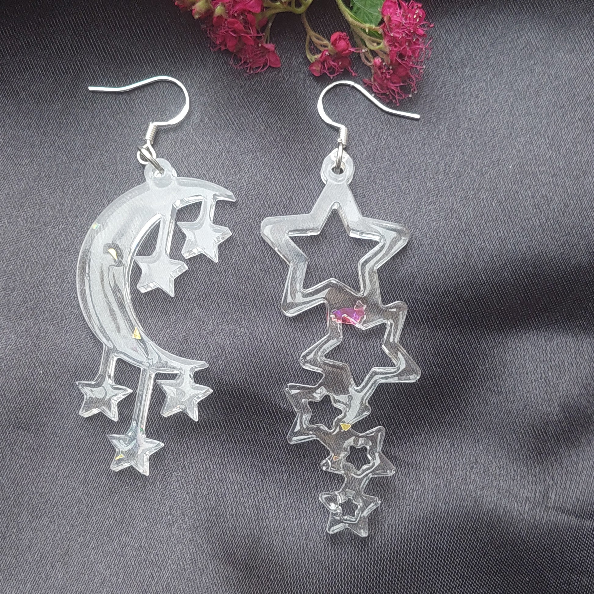 Kreative, asymmetrische Fantasie-Ohrringe – Klares, glasähnliches Harz – Ohrhaken aus 925er Sterlingsilber – Feen, Elfen, Sterne & Herzen – Geschenkbox