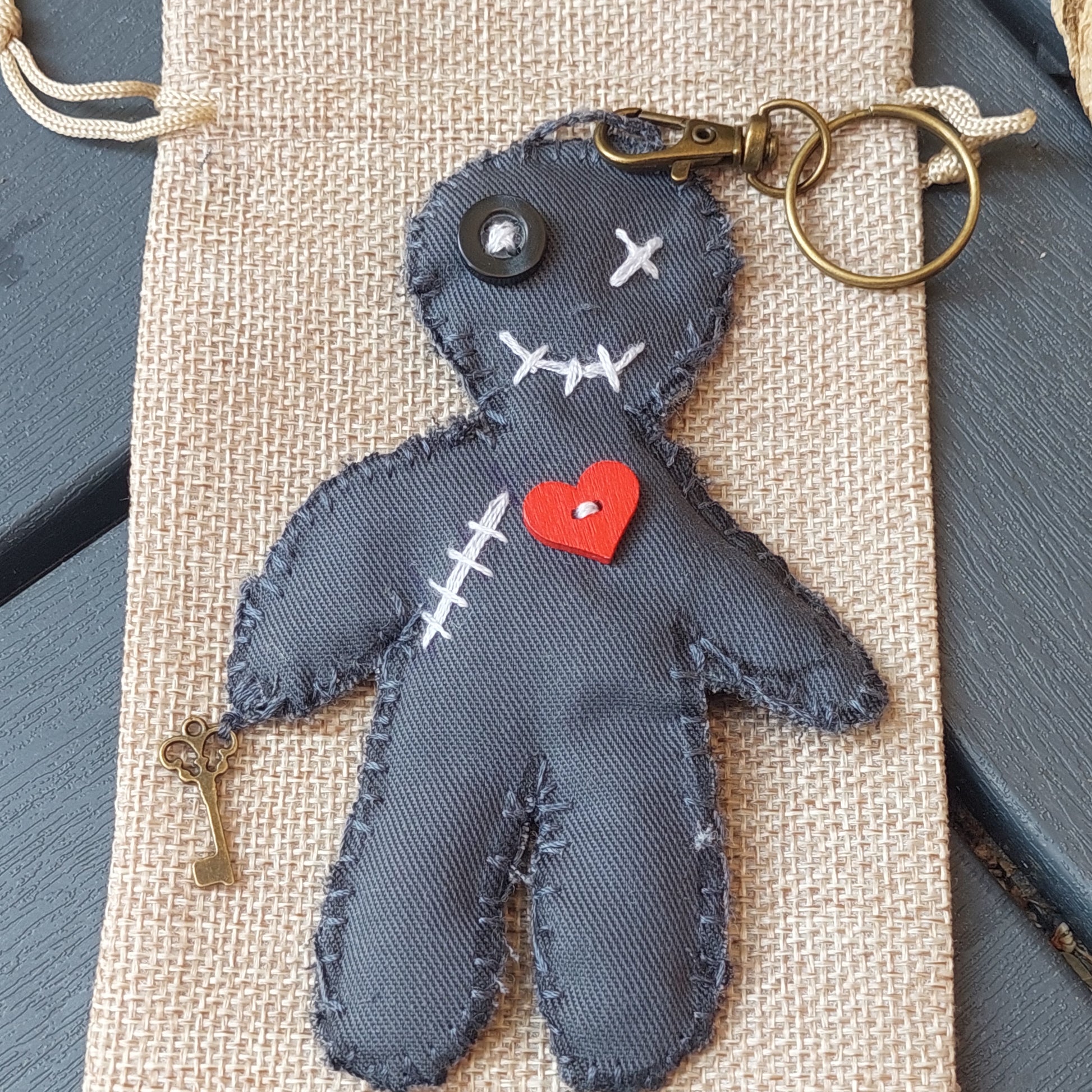Gothic Voodoo Doll Keychain – Handmade Plush Amulet with Heart & Key | Creepy Cute Gift