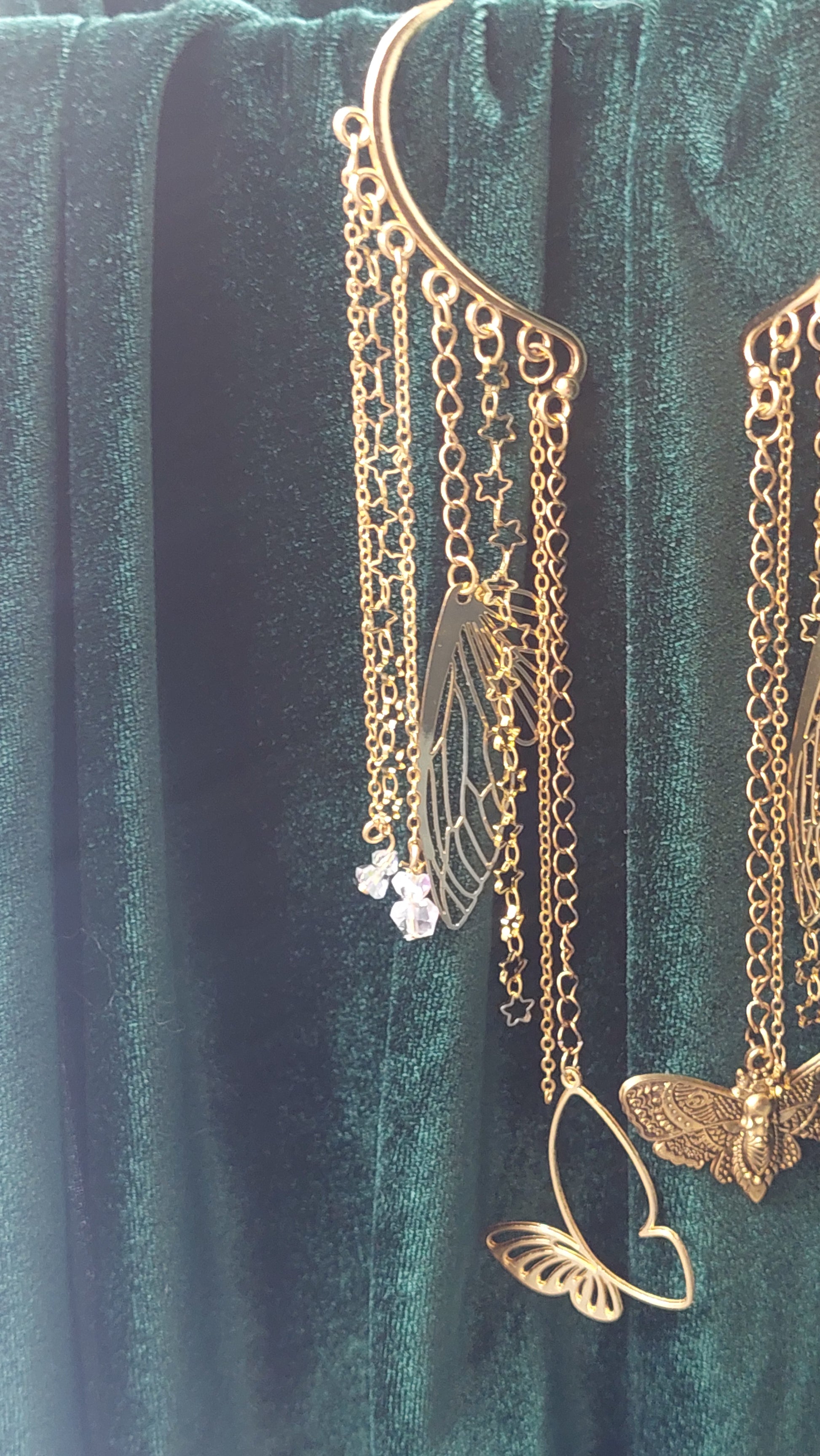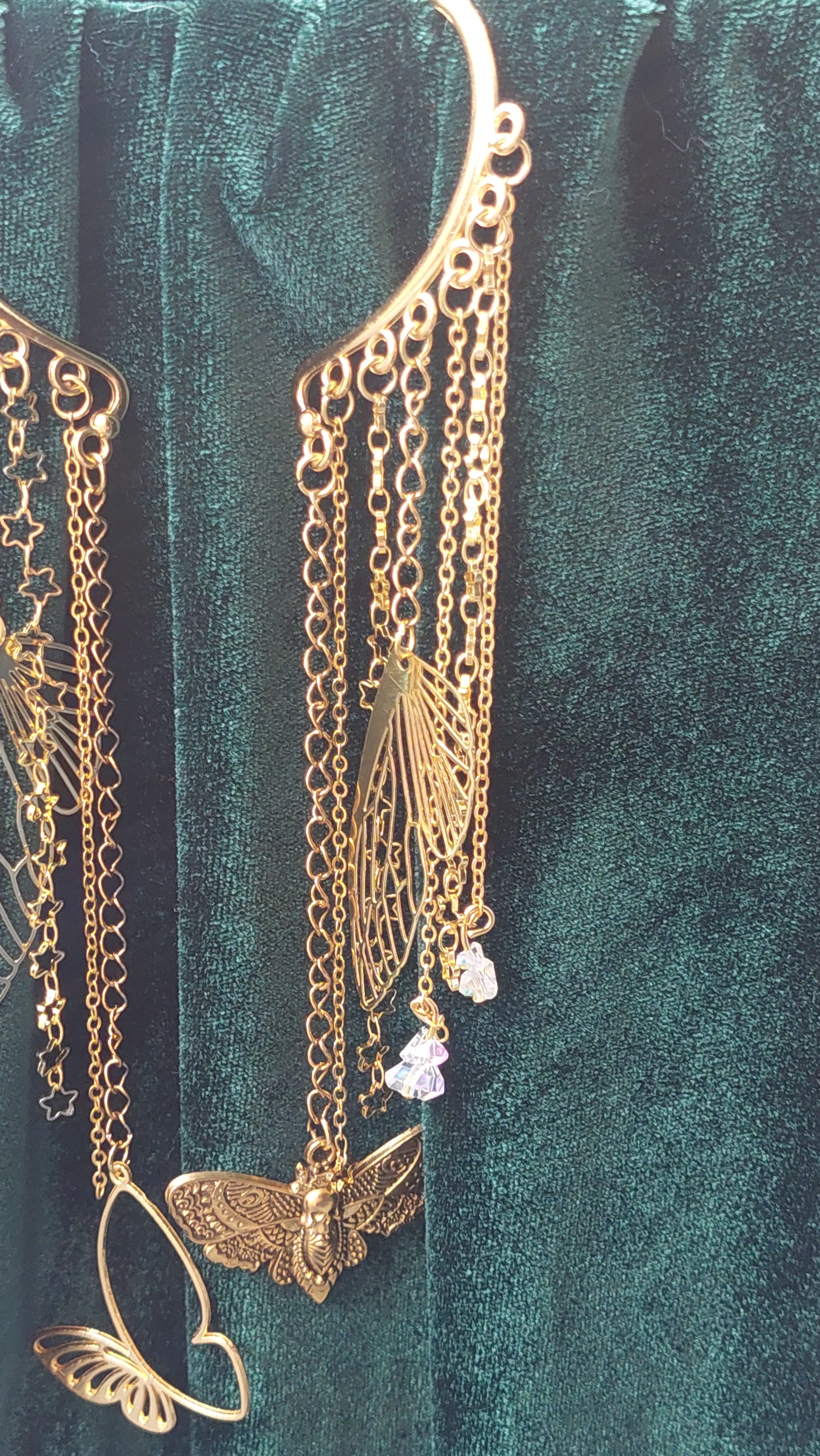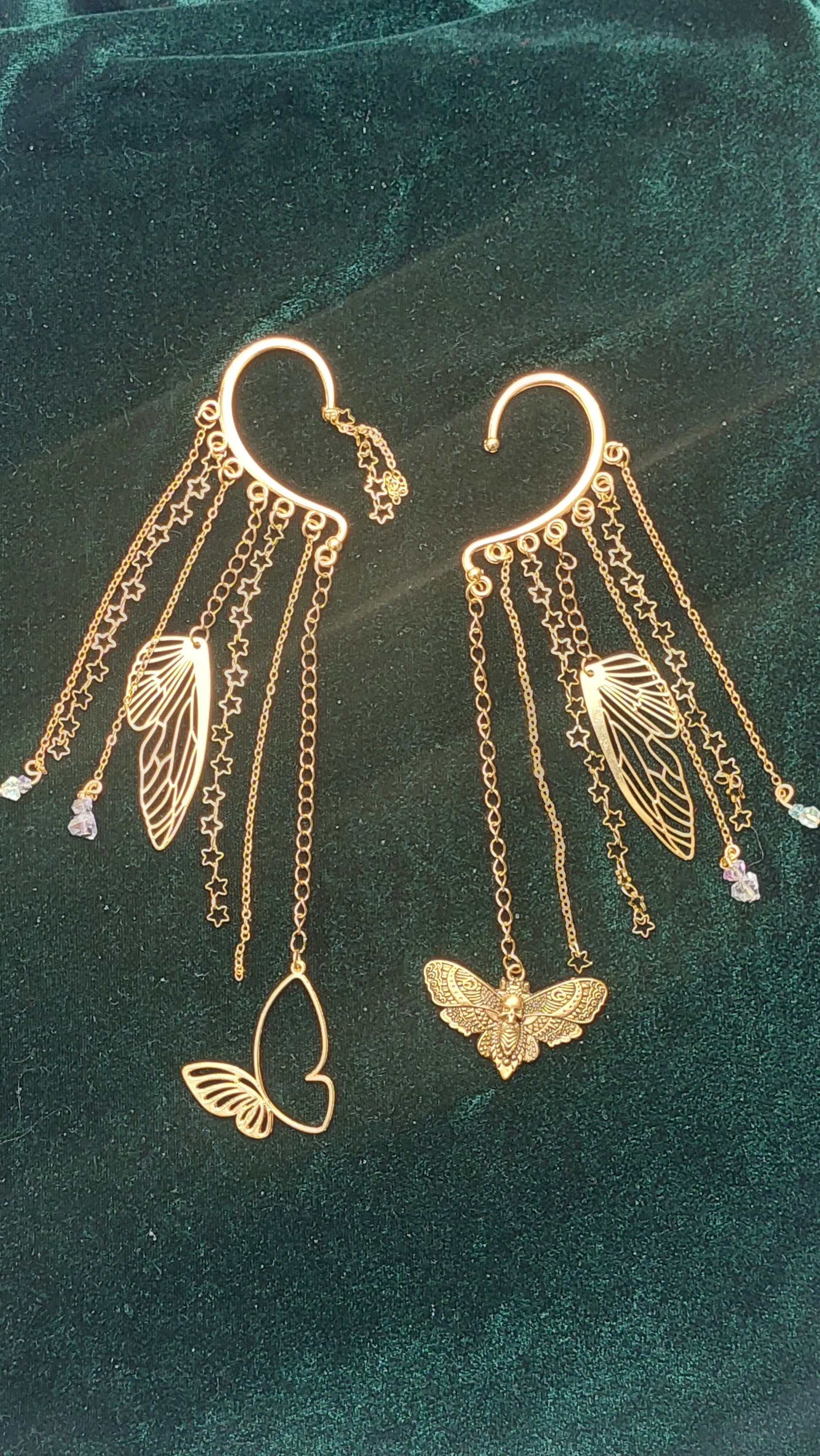 Each ear cuff is delicately adorned with golden chains, star charms, butterfly wings, and sparkling quartz crystals, creating an enchanting celestial look.